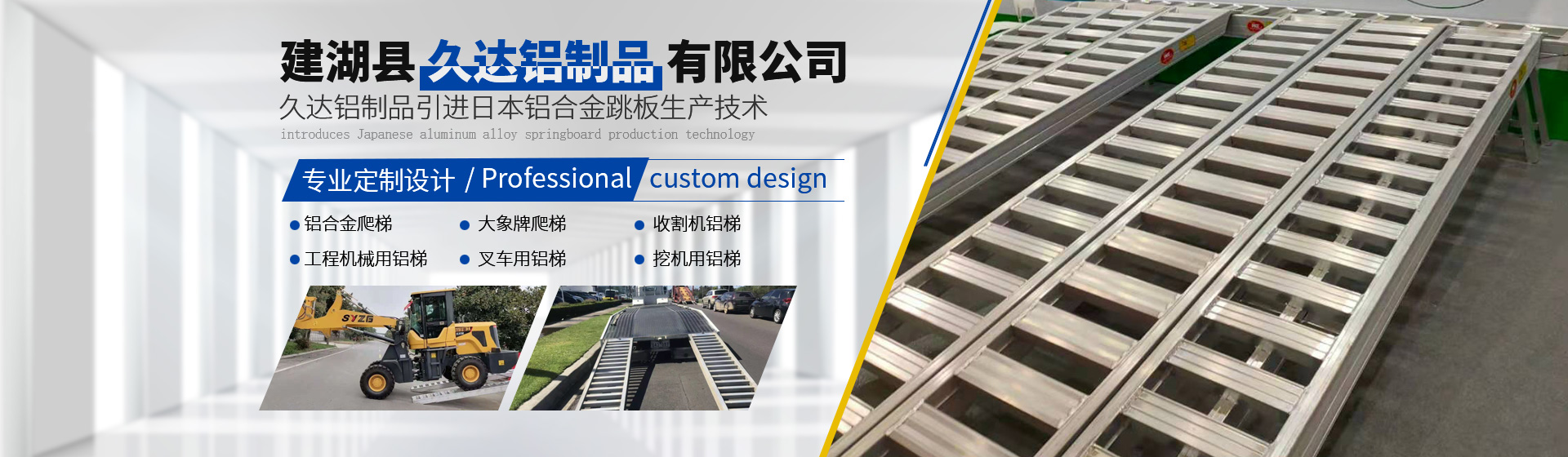 建湖縣久達鋁制品有限公司引進日本鋁合金跳板生產技術,專業生產高強度鋁合金跳板,廣泛應用于聯合收割機、拖拉機、插秧機、挖掘機等機械。 我公司于2012年引進日本全鋁合金跳板生產技術。經過四年的學習、探索、生產、銷售,現已全面消化吸收鋁合金跳板技術、總結出一套成熟的生產、使用、售后服務經驗;為提高產品質量,加大設備投入,購買歐洲進口的鋁合金焊接設備和切割設備,保證產品的焊接強度和精度;結合中國收割機作業量大、作業條件復雜、中國收割機更重等特點,生產出更適合中國國情的高強度鋁合金跳板,承載力更強,抗疲勞效果更好,使用周期更長,同等使用條件下是市場上仿制產品使用壽命的1.5倍以上。大象牌鋁梯成為中國鋁梯行業馳名品牌。